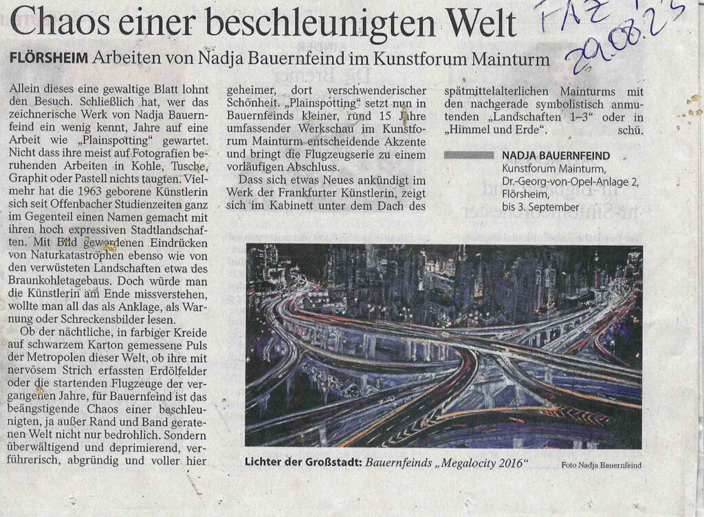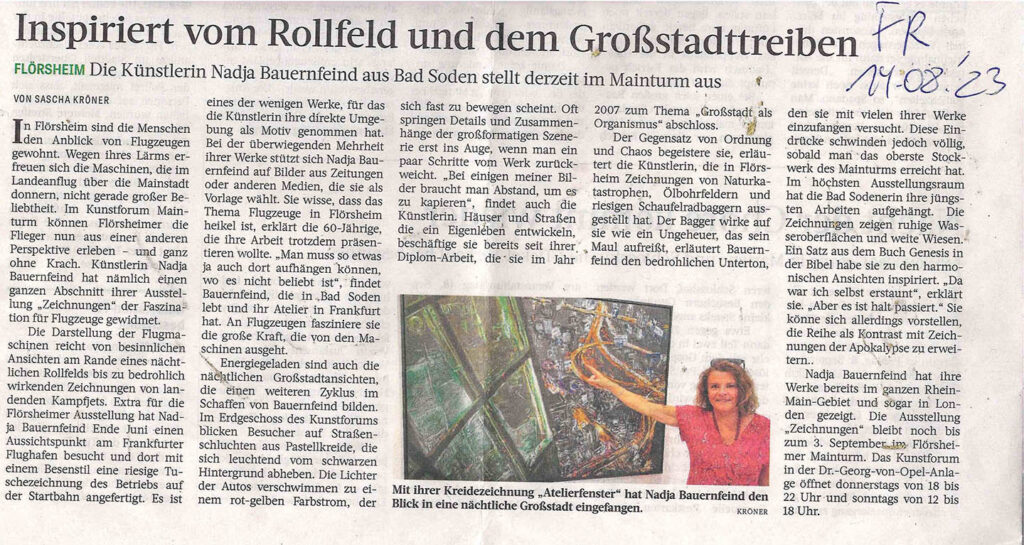 Seit ihren Studienzeiten an der Offenbacher Hochschule für Gestaltung hatte sich Nadja Bauernfeind vor allem mit an Ort und Stelle entstandenen Zeichnungen einen Namen gemacht. Mit dynamisch expressiven Blättern in teils gewaltigen Formaten, die mit Rohrfeder, Besenstiel und Tusche, mit Kohle, Eddingstift und Marker urbane Szenen in dramatischem Schwarzweiß verdichten. Aber vor vier, fünf Jahren kündigte sich im Werk der Schülerin von Manfred Stumpf und Dieter Lincke eine erste verblüffende Wende an. ….In ihrer ersten Einzelausstellung in der Frankfurter Galerie Schamretta kommt nun in Form von Wachsstift und Pastell auch noch buchstäblich Farbe ins künstlerische Spiel. Und leuchtet in die schwarze Nacht.